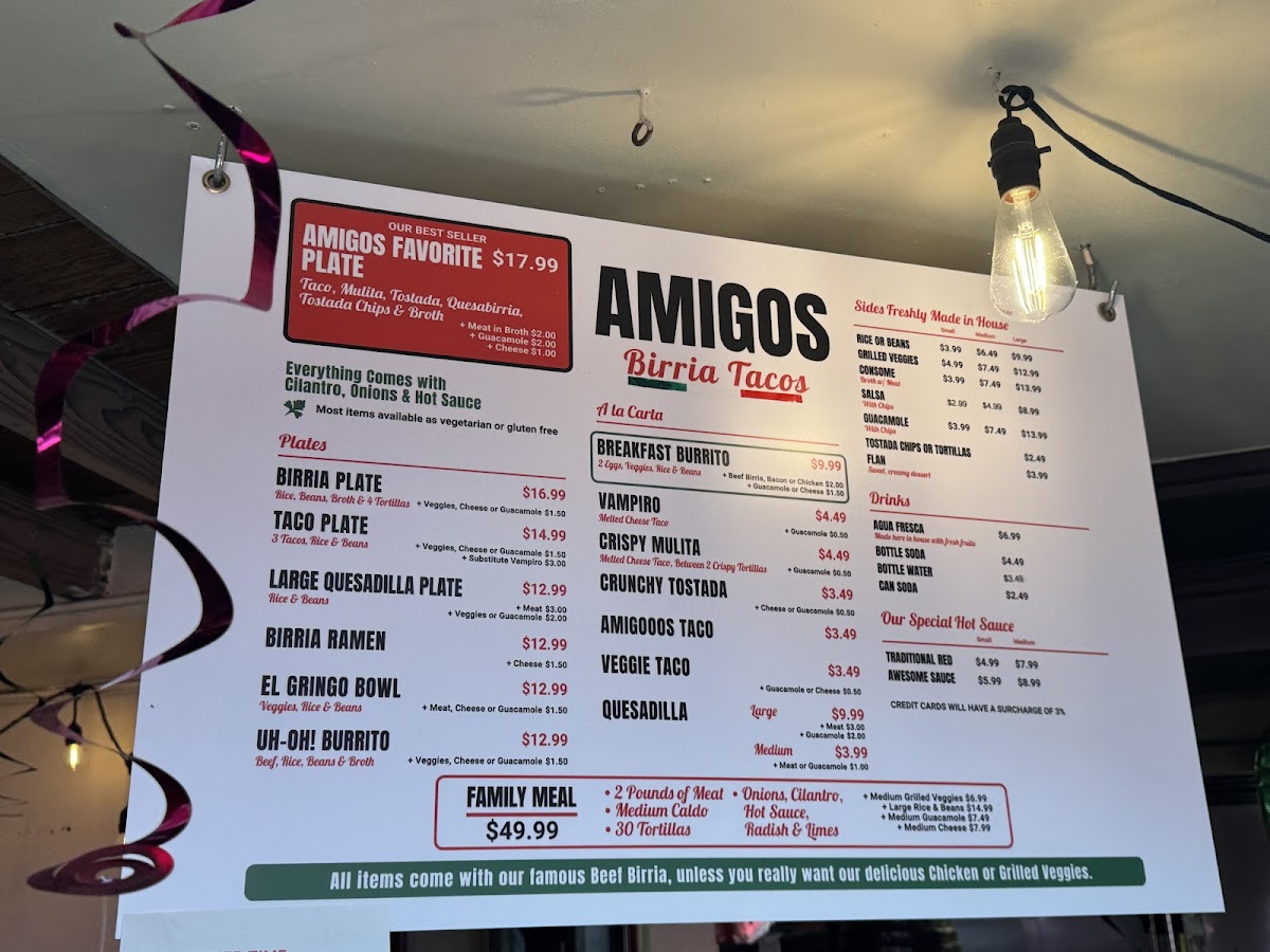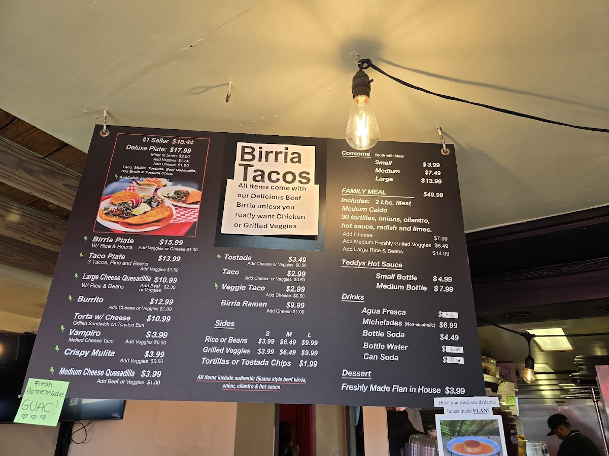 The menu features standouts like the Veggie Taco with Cheese, a medley of grilled bell peppers and onions, and the acclaimed shredded beef birria taco, both adorned with zesty toppings of onion and cilantro. Customers rave about the deliciousness and affordability of these dishes, with prices starting at just $3.11.
